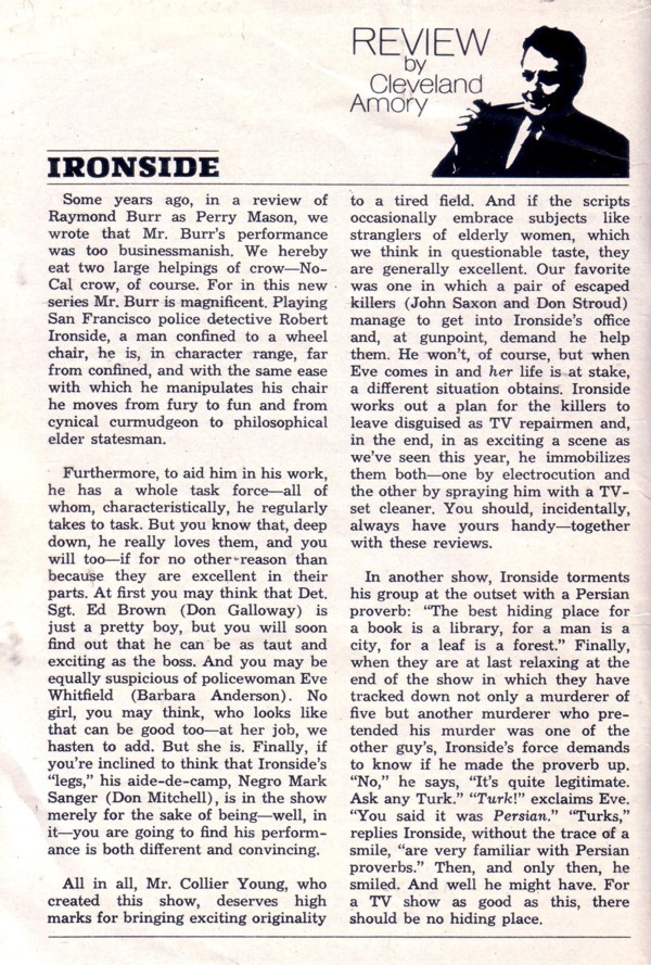 Quality: All recorded off-air to DVD SP. Available retail. Season 2 Available retail. Season 3 Available retail. Season 4 Available retail. Season 5 105. The Priest Killer 14Sep71 (2 hrs) 106. Contract: Kill Ironside 21Sep71 107. The Professionals 28Sep71 108. The Gambling Game 5Oct71 109. Ring of Prayer 12Oct71 110. In the Line of Duty 19Oct71 111. Joss Sticks and Wedding Bells 26Oct71 112. Murder Impromptu 2Nov71 113. Dear Fran… 9Nov71 114. If a Body See a Body 16Nov71 115. Good Samaritan 23Nov71 116. Gentle Oaks 25Nov71 117. License to Kill 2Dec71 118. Class of '57 16Dec71 119. No Motive for Murder 23Dec71 120. But When She Was Bad… 30Dec71 121. Unreasonable Facsimile 6Jan72 122. Find a Victim 13Jan72 123. And Then There Was One 20Jan72 124. Death by the Numbers 27Jan72 125. Bubble, Bubble, Toil and Murder 3Feb72 126. Achilles' Heel 17Feb72 127. His Fiddlers Three 2Mar72 128. A Man Named Arno 9Mar72 Season 6 129. Five Days in the Death of Sergeant Brown 14Sep72 (2 parts) (originally, part 1 is Ironside, part 2 is The Bold Ones, 19Sep72 ) 130. The Savage Sentry 21Sep72 131. Programmed for Panic 28Sep72 132. Down Two Roads 12Oct72 133. Camera…Action…Murder! 26Oct72 134. Riddle Me Death 2Nov72 135. Nightmare Trip 9Nov72 136. Buddy, Can You Spare a Life? 16Nov72 (2 hours) 137. The Countdown 23Nov72 138. The Deadly Gamesmen 30Nov72 139. Who'll Cry for My Baby? 7Dec72 140. Cold, Hard Cash 14Dec72 141. Shadow Soldiers 21Dec72 142. Ollinger's Last Case 4Jan73 143. A Special Person 11Jan73 144. The Caller 25Jan73 145. Love Me in December 1Feb73 146. The Ghost of the Dancing Doll 15Feb73 147. All About Andrea 22Feb73 148. Another Shell Game 1Mar73 149. All Honorable Men 8Mar73 150. The Best Laid Plans 15Mar73 151. A Game of Showdown 22Mar73 Season 7 152. Confessions: From a Lady of the Night 13Sep73 153. Murder by One 20Sep73 154. In the Forests of the Night 27Sep73 155. Fragile Is the House of Cards 4Oct73 156. The Armageddon Gang 11Oct73 157. House of Terror 25Oct73 158. The Helping Hand 1Nov73 159. Downhill All the Way 8Nov73 (2 hours) 160. Mind for Murder 15Nov73 161. The Hidden Man 29Nov73 162. Double-Edged Corner 6Dec73 163. The Last Payment 20Dec73 164. Friend or Foe 3Jan74 165. Two Hundred Large 10Jan74 166. Once More for Joey 17Jan74 167. Terror on Grant Avenue 31Jan74 168. Class of '40 7Feb74 169. The Taste of Ashes 14Feb74 170. A Death in Academe 21Feb74 171. Close to the Heart 28Feb74 172. Come Eleven, Come Twelve 7Mar74 173. Riddle at 24,000 14Mar74 174. Amy Prentiss: AKA The Chief 23May74 (2 hours) Season 8 175. Raise the Devil (1) 12Sep74 176. Raise the Devil (2) 19Sep74 177. What's New With Mark? 26Sep74 178. Trial of Terror 3Oct74 179. Cross Doublecross 10Oct74 180. Setup: Danger! 24Oct74 181. The Lost Cotillion 31Oct74 182. Run Scared 7Nov74 183. Act of Vengeance 14Nov74 184. Far Side of the Fence 21Nov74 185. The Over-the-Hill Blues 5Dec74 186. Speak No Evil 12Dec74 187. Fall of an Angel 19Dec74 188. The Visiting Fireman 26Dec74 189. The Return of Eleanor Rogers 2Jan75 190. The Faded Image 16Jan75 191. A Matter of Life or Death UNAIRED 192. The Organizer UNAIRED 193. The Rolling Y UNAIRED Reunion Movie R1. The Return of Ironside 4May93 (2 hrs) ![]()
